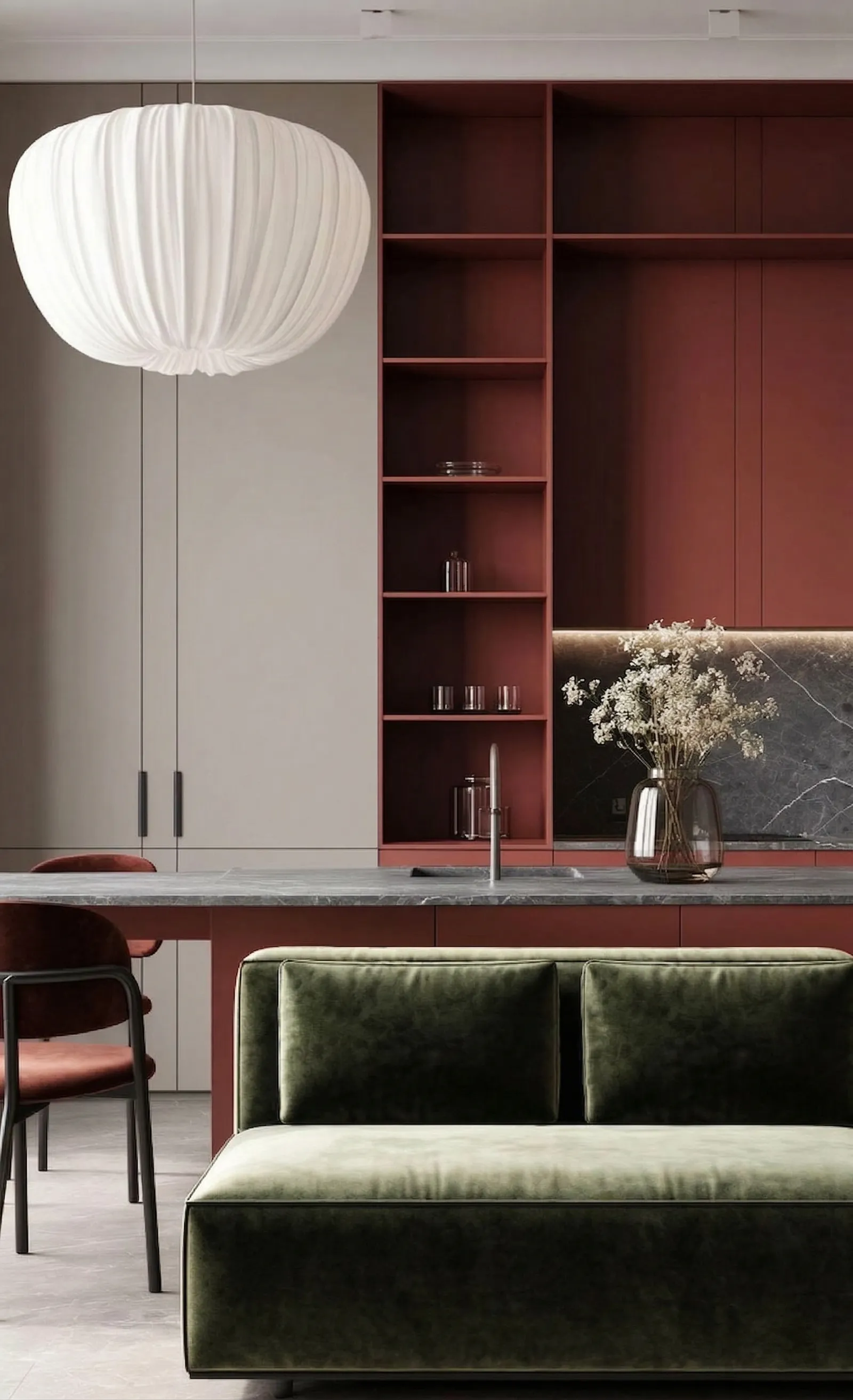 Кухня-остров с фасадами МДФ в терракотовом цвете. Мраморная столешница, открытые полки, дизайнерский светильник.