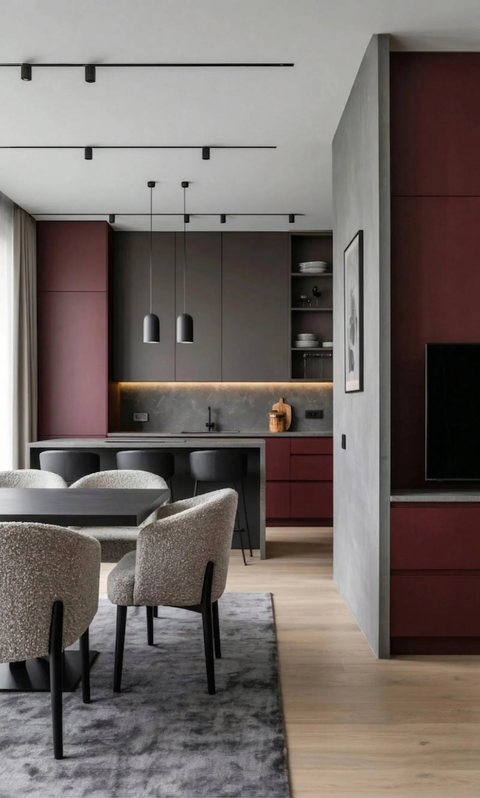 Линейная кухня с обеденной зоной. Фасады МДФ бордо и графит, трековое освещение, скрытые ручки.