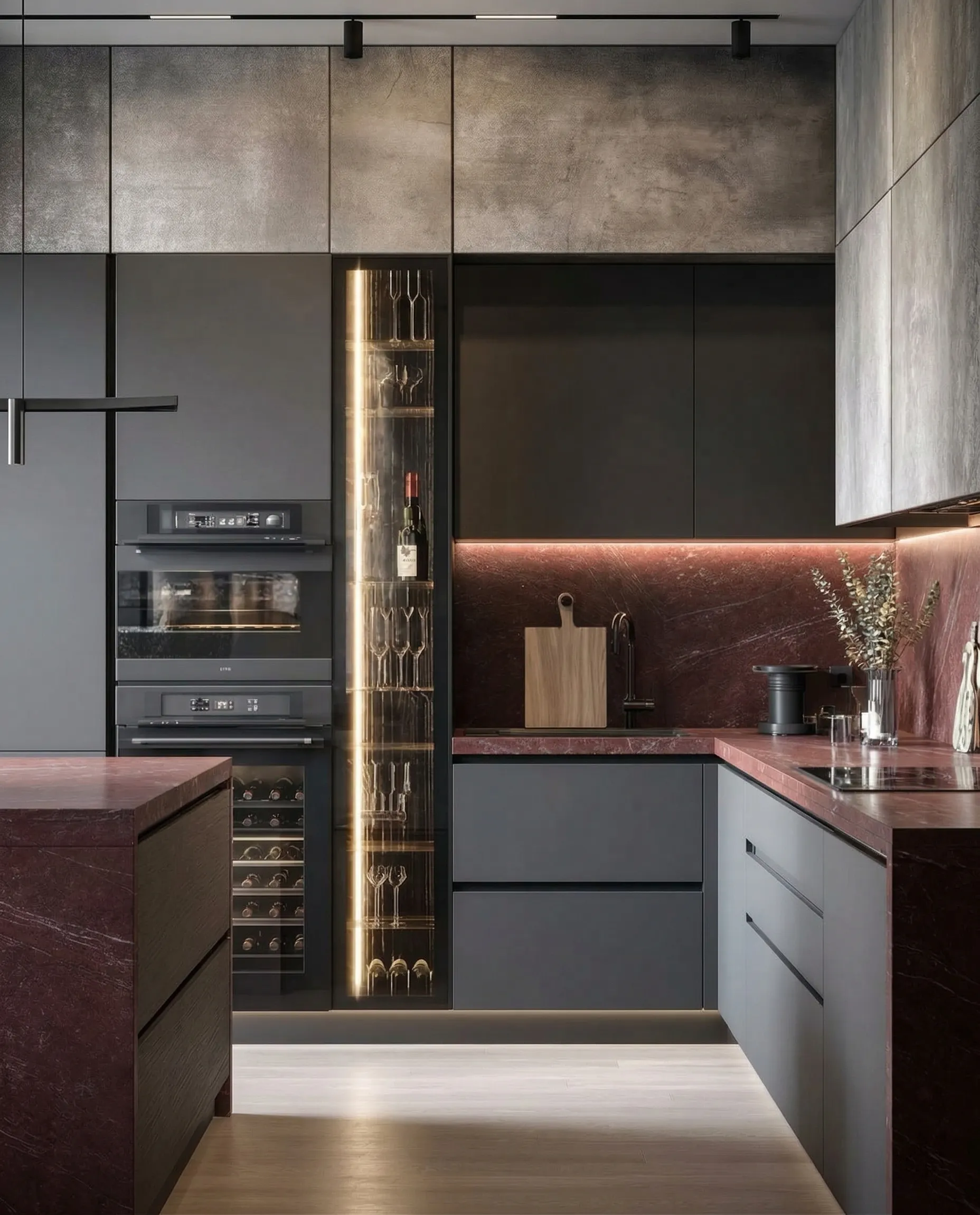 Угловая кухня с винным шкафом. Фасады МДФ с металлическим покрытием, бордовый мрамор, LED-подсветка витрин.