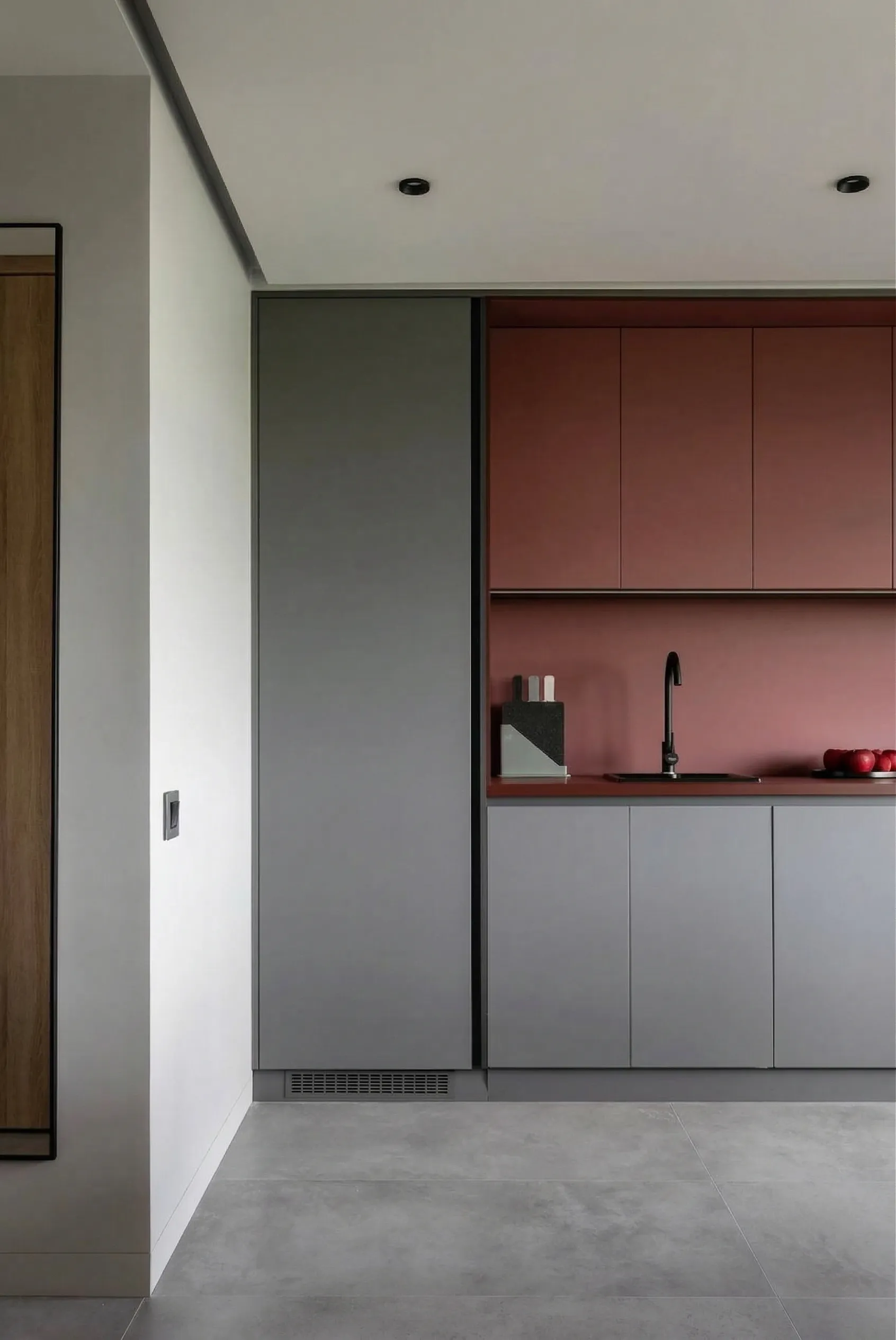 Компактная кухня в минималистичном стиле. Фасады МДФ, раздвижная система, скрытая техника, бетонная столешница.